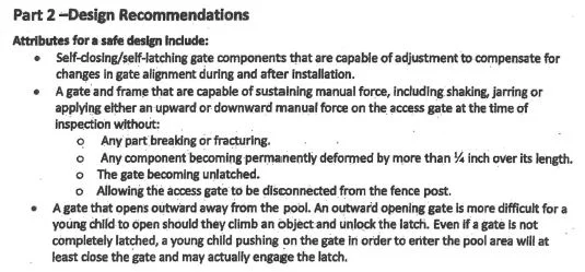 The Department of Health identifies two more critical features of a safe gate design: (1) the gate should open outward (pull rather than push), and (2) the gate must be constructed to function properly in spite of wear and tear.