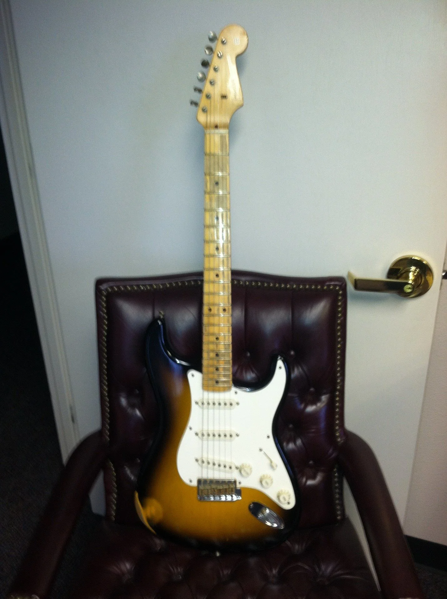 Garth Jones’ Fender Strat in a very legal looking chair.